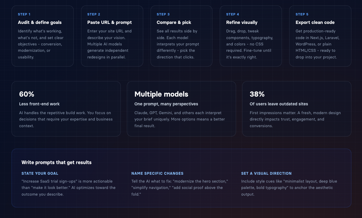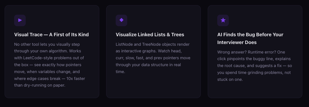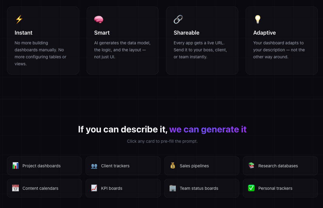 Often these rounded rects will feel like they should be links, but are not. They will have a short sentence or two claiming some functionality, and on cursor hover will do something eg move up slightly. But clicking them doesn't go anywhere. I think they aren't working links because it's very easy for AI to generate a splashy landing page, but harder to generate a non garbage project, and many AI users are happy with that. Also, AI often lays out text in bullet points or a very structured list of paragraphs, and rounded rects in a grid are the website equivalent of a list of short points.
